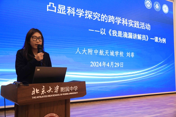 中国人民大学附属中学航天城学校的刘菲老师主要以“我是滴漏讲解员”为例进行分享。刘老师在教学五年级“计量时间”单元的学习内容时,挖掘古代水钟的发明者解决问题的思路,并将其转化为设计“我是滴漏讲解员”的跨学科学习活动的资源,整合其他学科的相关内容,并运用进阶性的科学探究活动促进课堂教学评价的发生,助力学生提升运用多个学科的知识和方法解决复杂问题的能力。