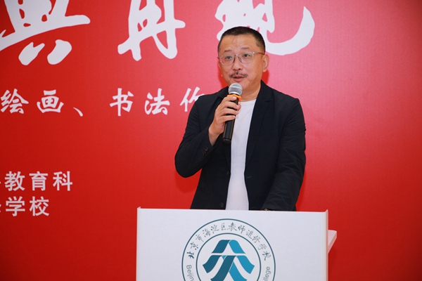 李可染画院秘书长李九红先生代表李可染画院讲话。李秘书长在发言中介绍了李可染画院“流动美术馆进校园”专项活动,希望和海淀区教师进修学校和海淀区各中小学一起,在校园内为孩子们打造固定的艺术空间,并长期提供浸润式美育活动的全方位支持,让“美术老师在美术馆中给孩子们上美术课”成为一种教学常态,推进美育全方位浸润校园。