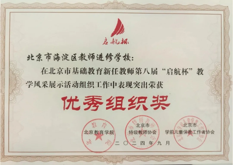 “启航杯”举办八年以来,海淀区屡创佳绩,展示了海淀区新任教师的风采,体现了海淀区新任教师培训的质量和水平。海淀区教师进修学校在展示活动组织工作中表现突出,荣获优秀组织奖。
