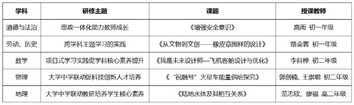 教研组学科研修展示及指导环节,包括主题研修特色介绍、各教研组研究课展示、学科研修展示以及教研员指导等内容。教研组研究课展示环节,聚焦“思政一体化助力教师成长”“跨学科主题学习的实践”“项目式学习实践促学科核心素养提升”“大学中学联动促科技创新人才培养”“大学中学联动教研培养学生核心素养”研修主题,并开五节研究课。