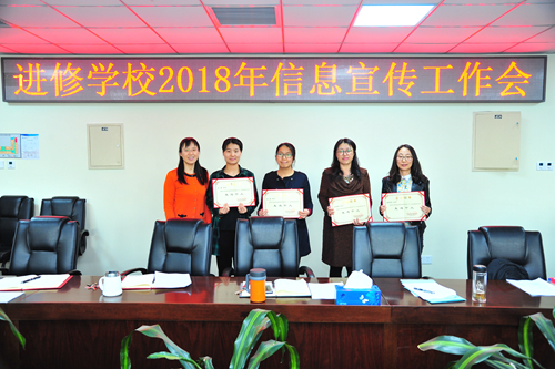 为鼓励信息员更多更好的投稿,把宣传工作做得更好,今年,首次评选了学校宣传工作先进个人,经过各部门推荐,学校研究决定,张晓、林秀艳、张瑞芳、王果、高琳五位同志为学校2017年度宣传工作先进个人,并在本次会上进行了表彰,申军红副校长为先进个人颁发了荣誉证书。