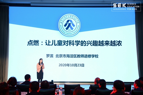 2020年10月23—24日,SEK2020中国儿童科学教育高峰论坛在北京召开。论坛以“让科学教育更科学——让科学教育燃起来”为主题,聚焦中国科学院儿童科普阵营展示、幼儿园科学教育研究与实践、儿童科学教育与创新人才培养、儿童科学教育场景设计与实现、儿童科学教育与信息技术融合等议题。罗滨校长、赵杰志副校长、李峰副主任、教研员田彭彭等参加论坛。罗滨校长受邀出席23日上午主题论坛,并以“点燃:让儿童对科学的兴趣越来越浓”为题作主题发言。