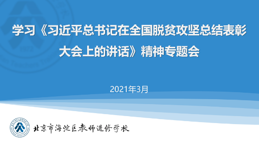 3月9日,海淀进校召开全校教职工大会,专题学习习近平总书记在全国脱贫攻坚总结表彰大会上的重要讲话精神,常务副校长申军红主持。