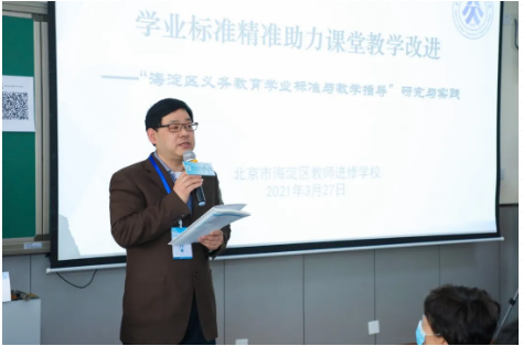 柏春庆主任以《学业标准精准助力课堂教学改进——“海淀区义务教育学业标准与教学指导”研究与实践》为题,从四个方面为与会者带来精彩的报告。贾素艳副校长从学校层面介绍了对学业标准的研究、落实和延展性使用。