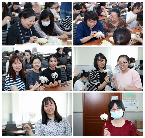 北京市信息管理学校李大春老师围绕端午的饮食文化习俗,为大家带来专题讲座。李老师介绍了粽子的由来、内涵、分类和食疗价值,各地端午节的传统习俗要吃“煎堆”“馓子”“薄饼”“艾团”“五黄”“蛋”等食物,来祈求安康、驱虫杀毒、驱瘟护孩。随后,李老师为教研员们边演示边讲解了如何雕刻出一朵蔬菜花。老师们边观察边动手操作,认真专注,一朵朵活灵活现的白菜菊在老师们的巧手下制作完成。