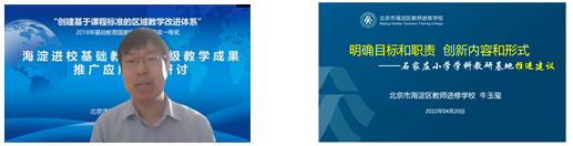在四位学科基地负责人分享工作思路与实践经验的基础上,海淀进校小学教研室副主任牛玉玺老师以“明确目标和职责 创新内容和形式——石家庄小学学科教研基地推进建议”为题,做了总体推进指导与建议。