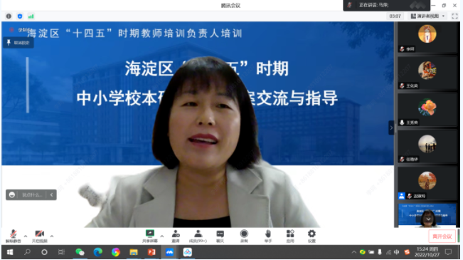 2022年10月27日下午,海淀进校师训部组织全区中小学校开展的“十四五”时期校本研修工作方案交流与指导活动顺利举行, 200余名教师培训负责人、指导专家和师训部教师线上参会。会议由海淀进校师训部副主任马萍主持。活动分成分组交流与专家指导、集中交流与专家引领两个环节展开。