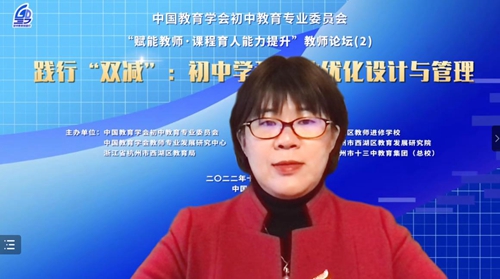 教师论坛聚焦“践行‘双减’:初中学科作业优化设计与管理”主题,由杭州市西湖区教育学术委员会常务副主任王曜君主持。
