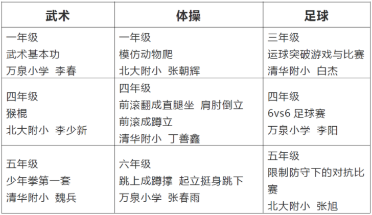北大附小贾宁副校长热情洋溢的致辞了拉开了教学展示环节的序幕,北大附小、万泉小学、清华附小三所学校的9名教师,为大家呈现了体操、武术、足球三个项目不同年级的课堂教学。
