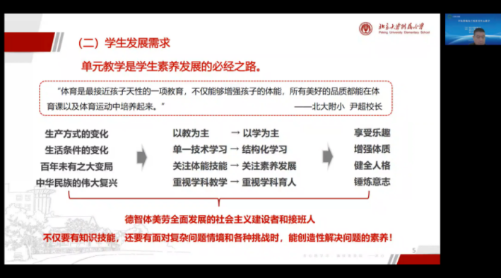 北大附小马立军老师以《单元“学练赛”一体化的探索与思考》为题做了专题汇报,他从单元“学练赛一体化”的背景、内涵、策略、实践问题及反思等四个方面进行了阐述。