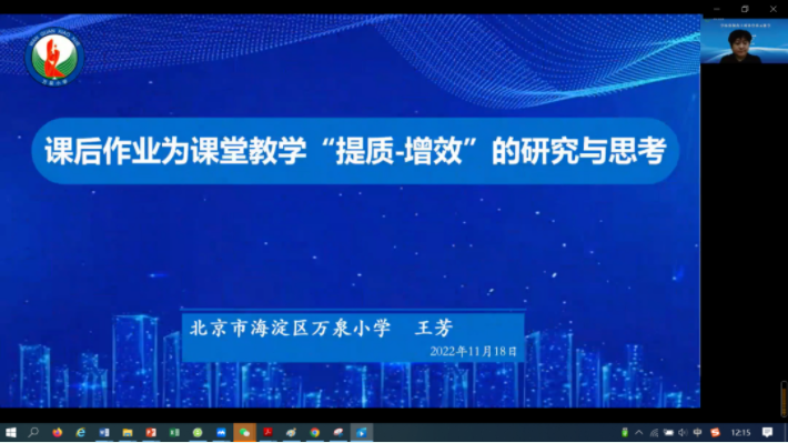 万泉小学王芳老师以《课后作业为课堂教学提质增效的研究与思考》为题做了专题汇报。王老师为老师们呈现了日常作业、课间作业、假期作业和线上作业等不同类型作业的案例,介绍了作业的设计、实施与评价策略,提出作业的有效落实要完善“家校合作”、“定期会商”、“专题研究”等机制,借助团队力量不断攻坚克难,借助信息平台强化反馈与指导,借助线上线下的小比赛促进学生参与、评价作业效果。
