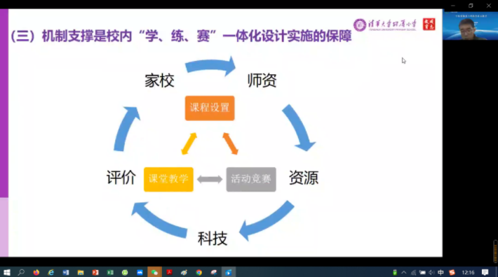清华附小任海江老师以《校内体育“学练赛”活动一体化设计实践》为题做了专题汇报,他从问题导向、实践做法、展望思考三个方面介绍了清华附小体育团队的研究与实践成果。