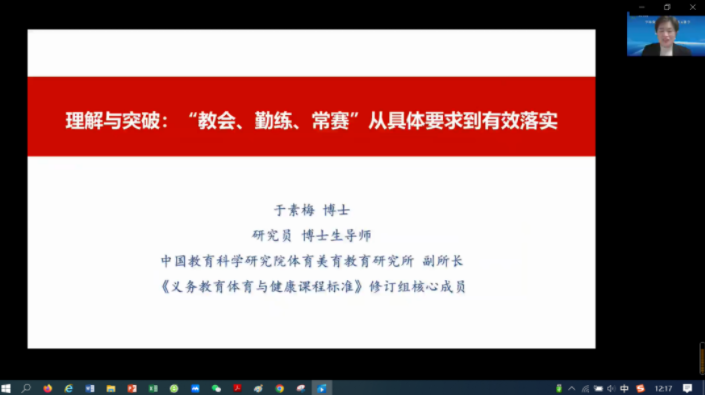 中国教育科学研究院体育美育教育研究所副所长于素梅以“理解与突破-教会、勤练、常赛从具体要求到有效落实”为题,从“深刻认识教会、勤练、常赛的内涵与要求”和“系统把握教会、勤练、常赛的价值与落实”两个方面做了专题讲座。