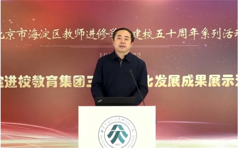 海淀区委教育工委副书记史怀远对海淀进校建校五十周年表示热烈祝贺,并表示看到集团三年一体化发展成果感到非常欣慰、振奋和感动。