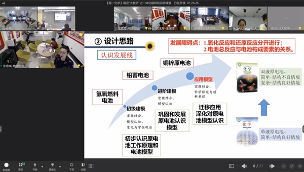 联研过程中,老师们围绕电池认识模型的表征和发展路径建构、实验素材的选取和使用、“目标-活动-评价”的一体化设计、技术赋能的教学实施、双师教学分工和策略的优化等内容展开深入交流和研讨,通过共享文档协同编辑,线上互动交流研讨成果。研讨层层递进,不断迭代优化教学设计和教学实践,共同突破化学学科中电池认识模型建构的关键难点,探索提升学生证据推理与模型认知素养的教学策略与路径,促进8所学校教师集群成长。